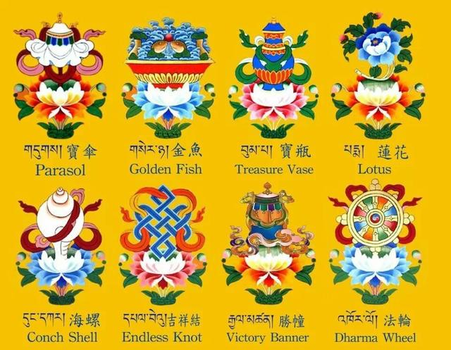 “佛教八寶”亦稱“吉祥八寶”或“八吉祥”或“八瑞相”等,即“輪螺傘蓋花罐魚(yú)長(zhǎng)”,展開(kāi)來(lái)就是法輪、法螺、寶傘、白蓋、蓮花、寶瓶(罐)、金魚(yú)(雙魚(yú))、盤長(zhǎng)(吉祥結(jié))。
