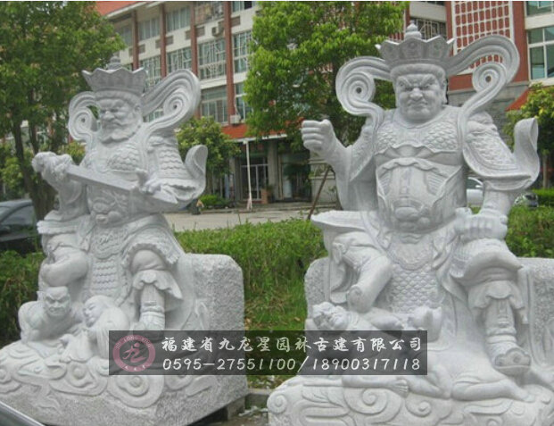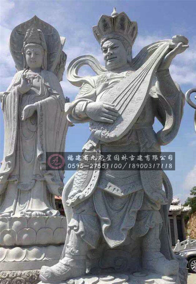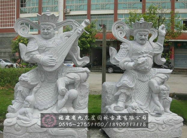 佛經(jīng)上說四大天王就在須彌山山腰,那時聳立著健陀羅山峰,稱須陀四寶山,此山有四山峰,高三百三十六萬里?!八膶毸?東面黃金,西面白銀,南面琉璃,北面瑪瑙”。天王各居一山,他們的任務(wù)是各護一方世界,即佛教說的須彌山四方的東勝神洲、南贍部洲、西牛貨洲、北俱盧洲。故四天王又稱“護世四天王”。四天王各有九十一子,輔佑四天王守護空間十方,即東、西、南、北、東南、西南、東北、西北以及上下。四天王手下又各有八位大將,幫助管理各處山河、森林以及地方上的小神。