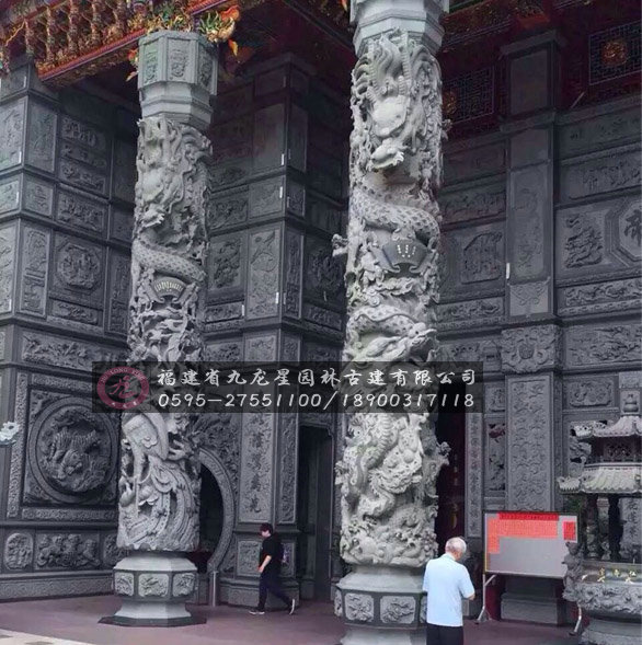 石雕(青石)龍柱上的龍是神靈瑞獸,它主要來自于人們幻想的神話傳說,經(jīng)過時(shí)間的演變后,有些乃與宗教思想結(jié)合,尤其是受到道教和佛教思想的影響,而使其轉(zhuǎn)化為具有特殊之異能,進(jìn)而受到人們的信仰及崇拜。在臺(tái)灣廟宇的裝飾中,神靈瑞獸占有相當(dāng)之地位,它反映了民族文化中的信仰、幻想,及對(duì)于國泰民安世界之企望。