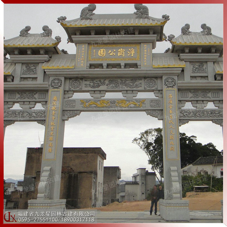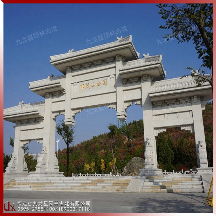 石牌坊是用石材修建的一種建筑類型,不僅結(jié)構(gòu)自成一格,別具風(fēng)采,而且集雕刻、繪畫、匾聯(lián)文辭和書法等多種藝術(shù)于一身,熔古人的社會生活理念、封建禮教、封建傳統(tǒng)道德觀念、古代的民風(fēng)民俗于一爐,具有瑰麗的藝術(shù)魅力、很高的審美價值和豐富而深刻的歷史文化內(nèi)涵。三門石牌坊就是建有三個門的石雕牌坊樣式,適用于寺廟景區(qū)、園林廣場、別墅小區(qū)、村莊路口等裝飾擺設(shè)。