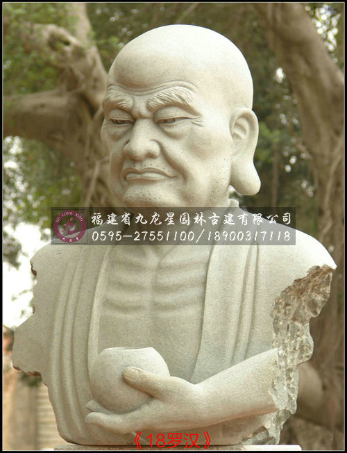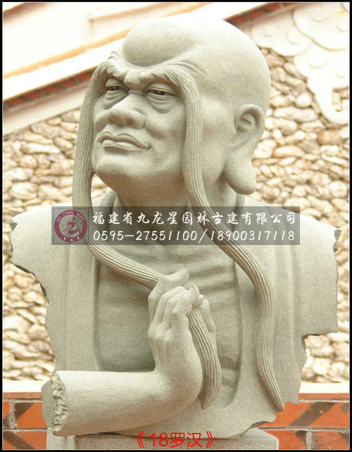 十八羅漢半身像雕塑采用天然優(yōu)質(zhì)石材花崗巖精雕而成,因為花崗巖的自然感染力,加上十八尊羅漢像惟妙惟肖,神態(tài)栩栩如生,使得整套羅漢雕像與園林形成渾然一體的感覺。