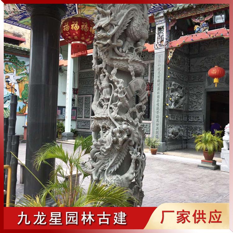 按造型分:有單龍柱、雙龍柱、滾龍柱、盤(pán)龍柱、蟠龍柱、華表柱、龍鳳柱、八仙龍柱等多種造型雕刻。