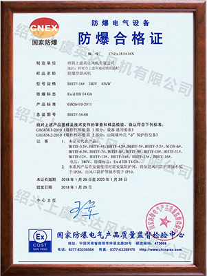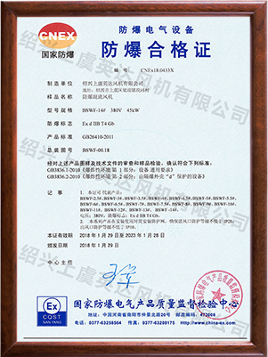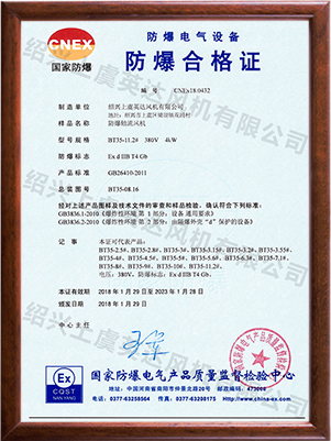 為適應(yīng)防爆環(huán)境需要,風(fēng)機(jī)可做成防爆風(fēng)機(jī),防爆等級(jí)為EXdⅡBT4,適用于易燃、易爆氣體的場(chǎng)所。整機(jī)通過(guò)國(guó)家防爆認(rèn)證。
